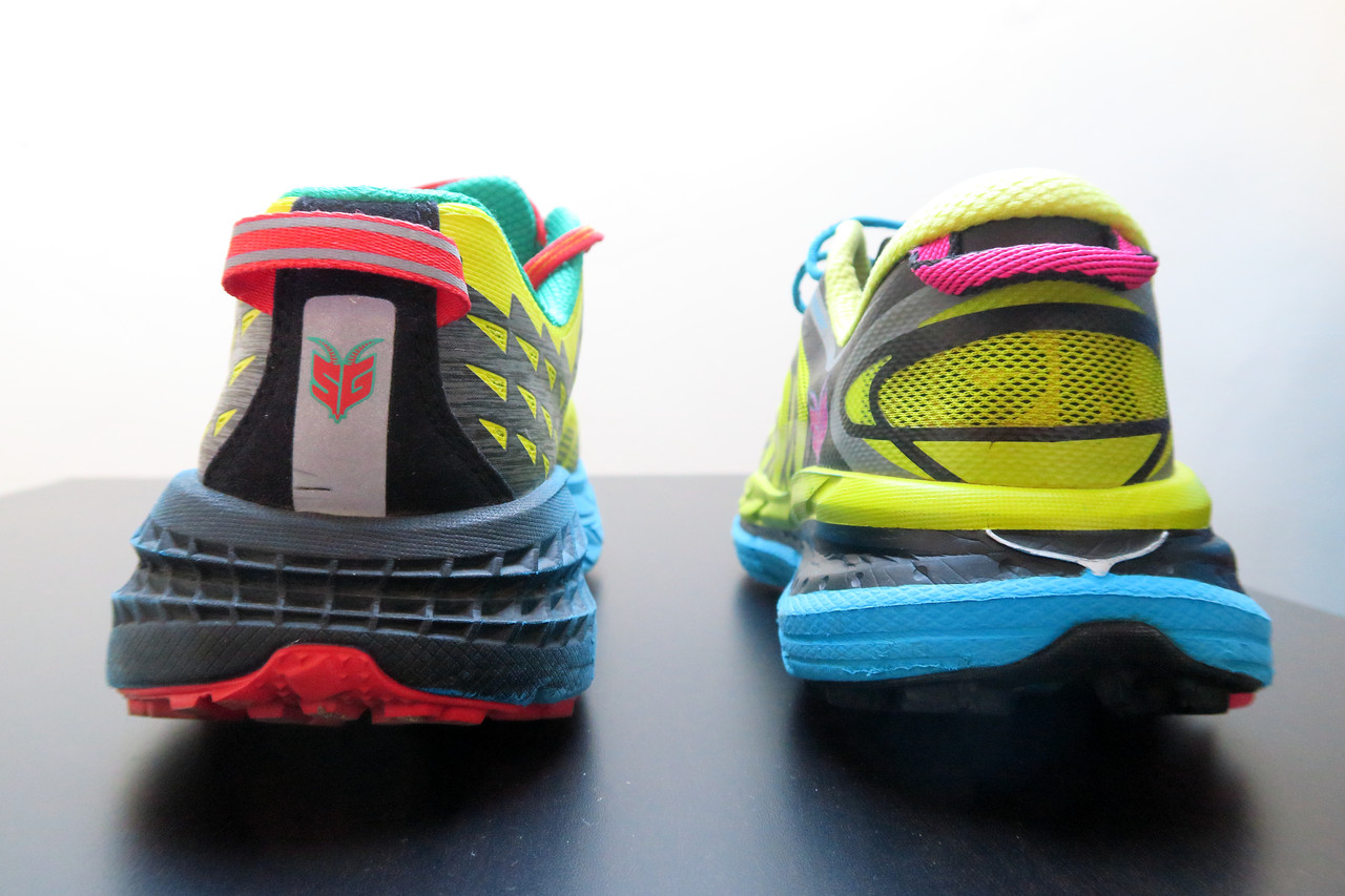 On voit assez nettement l'évolution de la tige. La languette est plus épaisse, et on passe de 4/5 oeillets à 6 pour le laçage. Cela explique largement à mon avis la faible efficacité de la première version de la SpeedGoat à ce niveau, et effectivement la V2 est plus efficace. Enfin disons qu'elle maintient le pied comme une chaussure doit le faire, tout simplement.