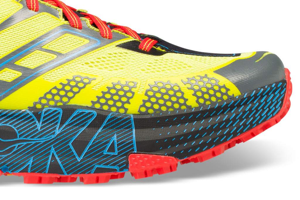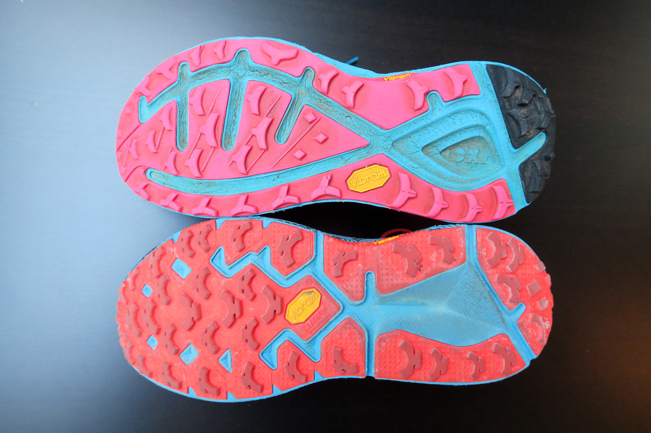 L'avant du pied a aussi été totalement revu. Le pare pierre plus imposant, remonte plus haut. En terme de longévité, il faudra attendre un peu et je reviendrai ici sur l'article dans quelques mois pour voir si les faiblesses du mesh (on le voit sur la V1 sur le coté, l'usure est évidente et systématique chez Hoka) sont encore présentes sur la SpeedGoat 2.