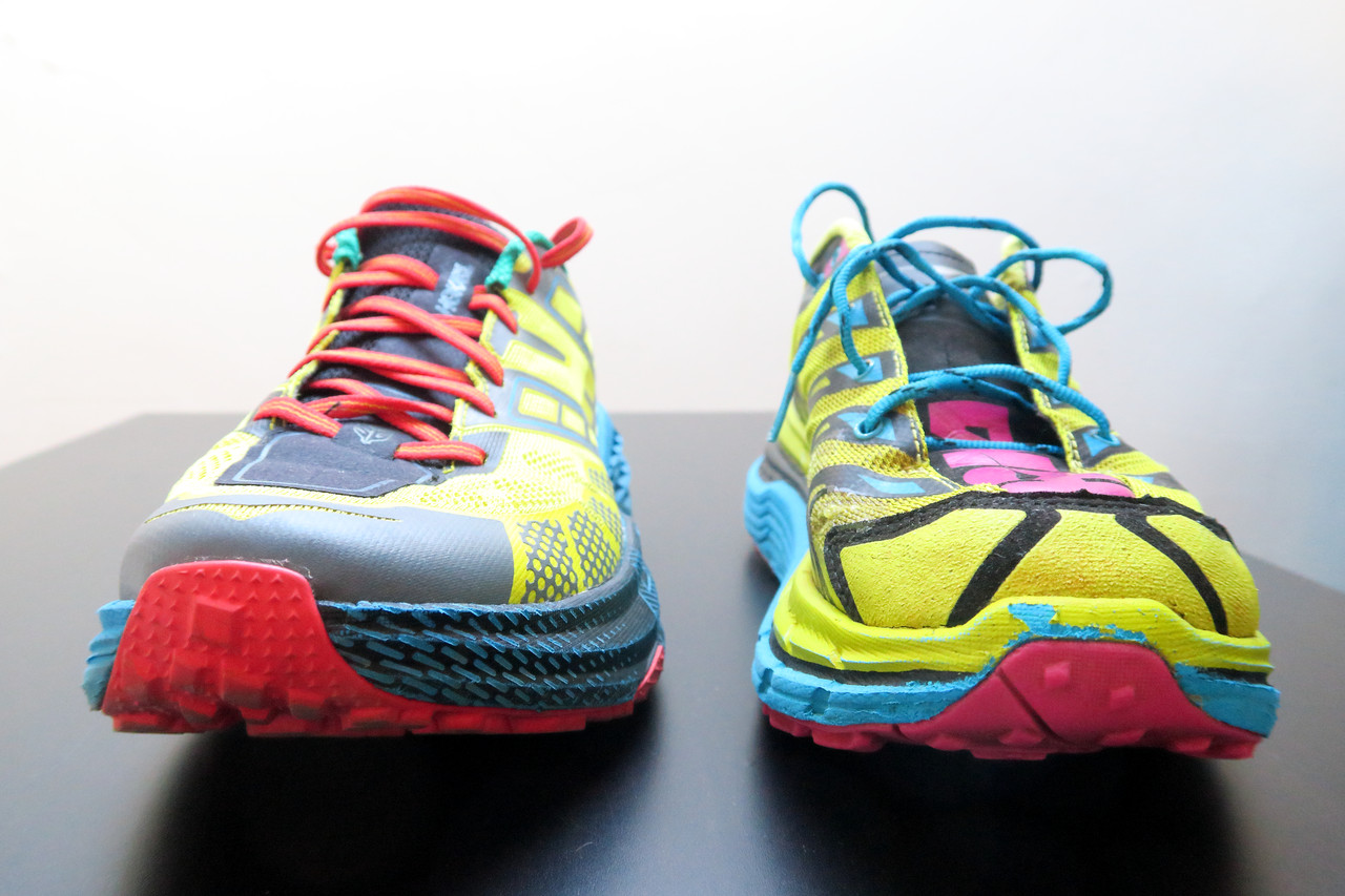 Je n'ai pas encore eu l'occasion de les avoir en main mais cela ne saurait tarder. Cela fait maintenant deux mois que je teste les Hoka SpeedGoat 2. J'ai du faire environ 200km avec et je peux désormais vous donner mon ressenti à leur sujet. Même si cette nouvelle édition conserve le même nom, il s'agit d'une refonte complète. J'ai fait quelques photos où je juxtapose l'ancien et le nouveau modèle, c'est assez clair. Le chausson, le mesh, les protections sur les cotés et sur l'avant du pied, ainsi que la semelle sont différents de ceux de la SpeedGoat première édition.